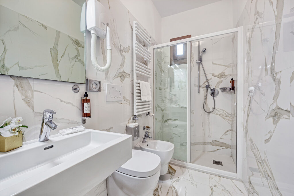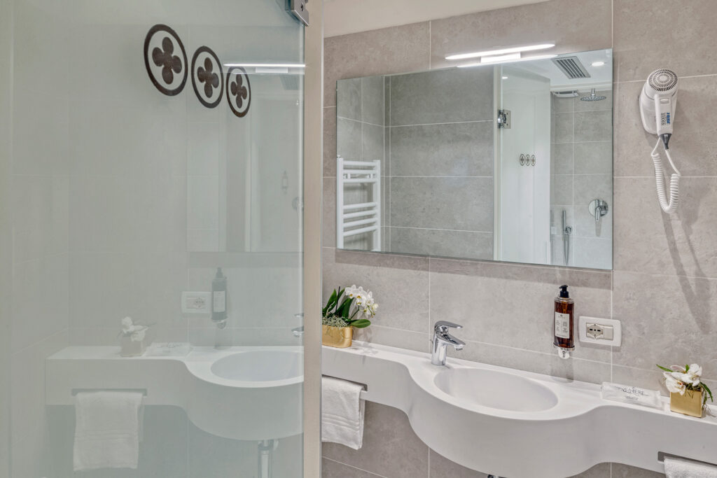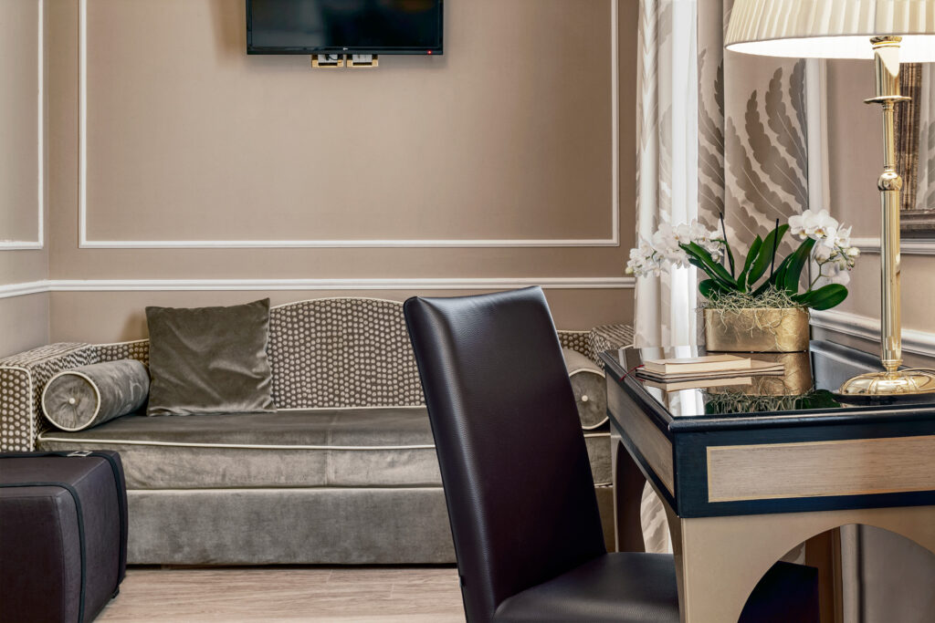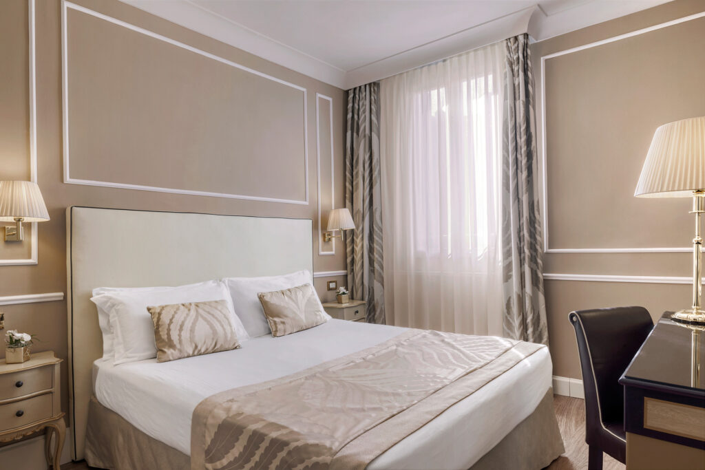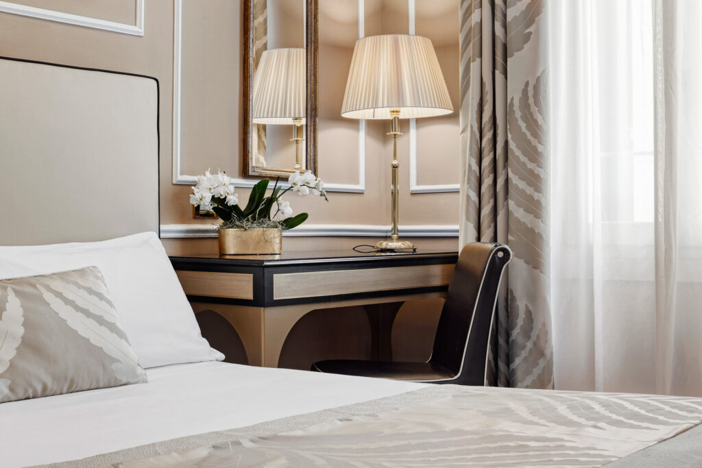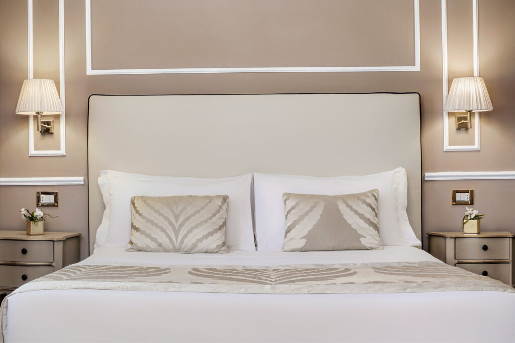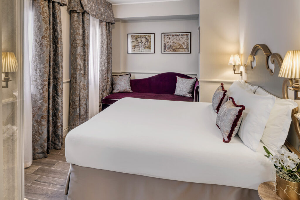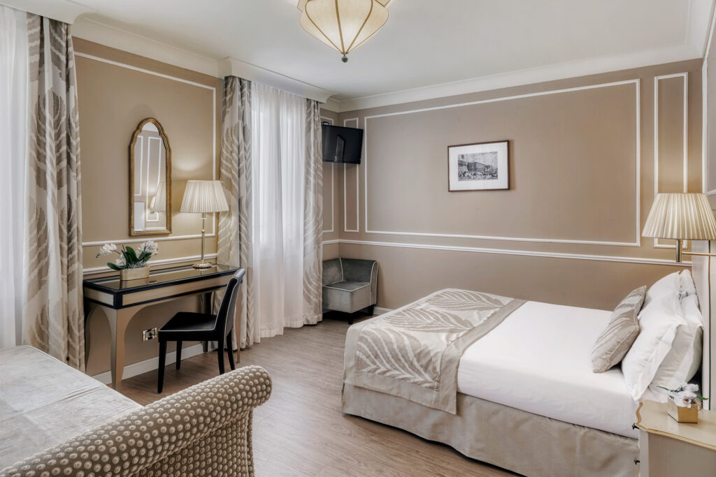 Chambre spacieuse, située dans le bâtiment adjacent, entièrement rénovée dans la disposition, le mobilier et les tissus, dans un style vénitien, avec des tons neutres qui contribuent à l’atmosphère relaxante et familiale.La salle de bain a également été repensée et construite avec des matériaux raffinés et élégants.La chambre est équipée de la climatisation, d’une télévision à écran plat avec chaînes satellite, d’un mini-bar, d’un coffre-fort, d’une connexion Wi-Fi gratuite, d’un téléphone et d’une bouilloire.